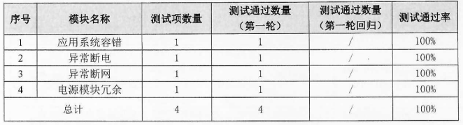 可靠性方面:測(cè)試范圍包括應(yīng)用系統(tǒng)容錯(cuò)、異常斷電、異常斷網(wǎng)、電源模塊冗余共4個(gè)模塊,執(zhí)行四條用例,全部通過(guò)。