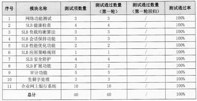 功能性方面:測(cè)試范圍包括網(wǎng)絡(luò)功能測(cè)試、SLB健康檢查、SLB負(fù)載均衡算法、SLB會(huì)話保持功能、SLB安全防護(hù)、SLB擴(kuò)展測(cè)試等11個(gè)模塊,共計(jì)執(zhí)行40條用例,均通過(guò)測(cè)試。