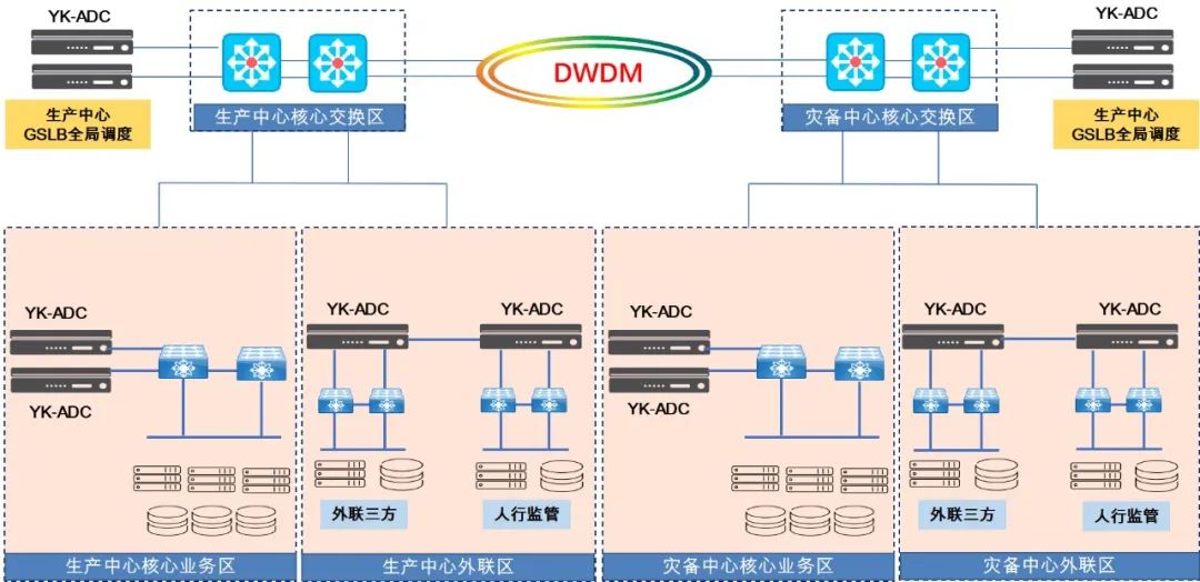 生產(chǎn)中心和災(zāi)備中心為對(duì)稱部署,兩個(gè)中心使用波分技術(shù)實(shí)現(xiàn)互相連接;