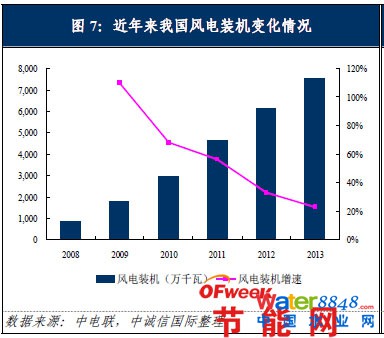 風(fēng)電是近年來發(fā)展最快的新能,風(fēng)電所發(fā)電量占所有電源發(fā)電量的比重自2008年的低于0.5%逐年增長至2012年的2.00%左右,2013年進一步增長至2.5%以上。