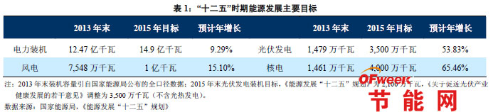 根據(jù)能源發(fā)展“十二五”規(guī)劃,到2015年我國電力裝機容量將達(dá)到14.9億千瓦,其中,風(fēng)電、太陽能和核電的裝機容量分別達(dá)到10,000萬千瓦、3500萬千瓦和4000萬千瓦。