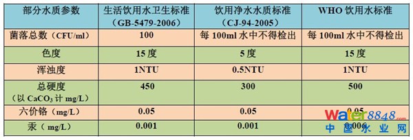生活飲用水國標、飲用凈水國標以及WHO飲用水標準部分參數的對比,水質檢測的指標有百來項,以上擇取了標準中存在差異的部分指標。