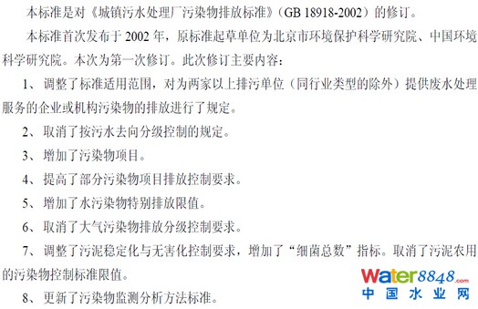 2015年11月4日,環(huán)境保護(hù)部科技標(biāo)準(zhǔn)司發(fā)布《城鎮(zhèn)污水處理廠污染物排放標(biāo)準(zhǔn)(征求意見(jiàn)稿)》(以下稱,征求意見(jiàn)稿),向社會(huì)各界廣泛征集修訂意見(jiàn),國(guó)家環(huán)境保護(hù)標(biāo)準(zhǔn)《城鎮(zhèn)污水處理廠污染物排放標(biāo)準(zhǔn)》(GB 18918—2002)將在發(fā)布13年后首次修訂。征求意見(jiàn)稿中主要涉及8項(xiàng)修訂內(nèi)容,包括調(diào)整適用范圍、取消按去向分級(jí)控制、增加污染物項(xiàng)目、提高排放要求、增加特別排放限制、取消大氣污染排放分級(jí)、調(diào)整污泥控制要求、更新監(jiān)測(cè)標(biāo)準(zhǔn)。