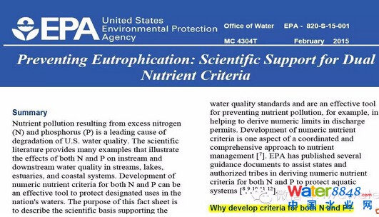 美國(guó)EPA2015年2月發(fā)布了《Preventing Eutrophication: Scientific Support for Dual NutrientCriteria》一文,強(qiáng)調(diào)了對(duì)于防控富營(yíng)養(yǎng)化:營(yíng)養(yǎng)鹽采用N、P雙指標(biāo)控制的必要性及科學(xué)依據(jù)。這與近兩年的國(guó)際上的研究結(jié)果基本一致。強(qiáng)調(diào)了“Controlling only P may not effectively prevent the occurrence ofharmful algal blooms in freshwaters.”(只進(jìn)行P的控制可能無(wú)法有效預(yù)防淡水水體有害藻類的發(fā)生),因?yàn)閷?shí)踐證明,在富N/貧P環(huán)境下,一樣會(huì)發(fā)生大規(guī)模的藻類爆發(fā)。