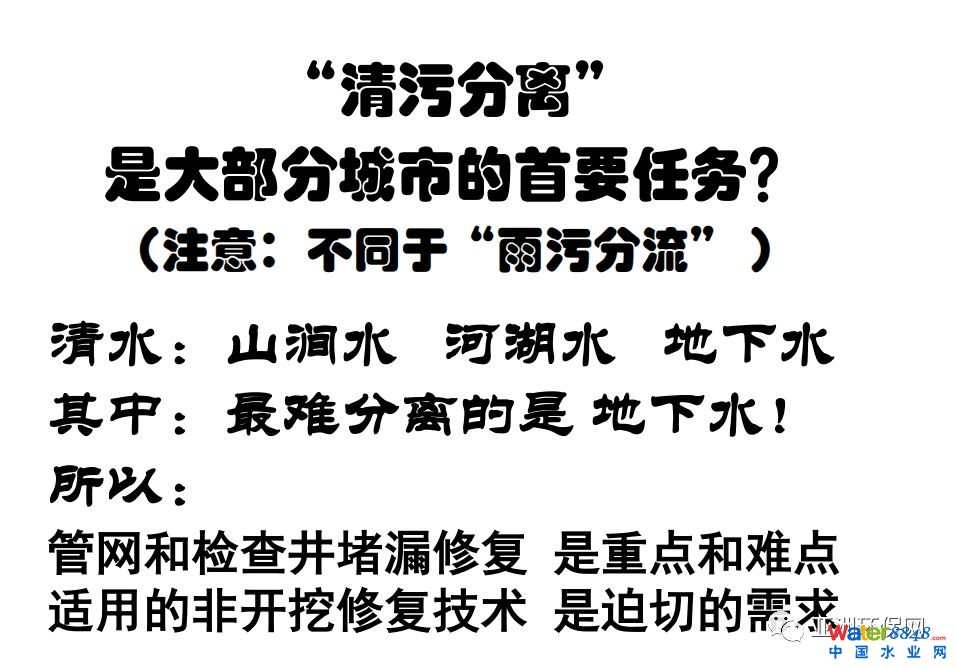 “清水包括山澗水、河湖水、地下水。檢測證明,大量是從管網(wǎng)漏進(jìn)來的。特別是地下水,量大面廣最難分離,因此,管網(wǎng)和檢查井堵漏修復(fù)是重點(diǎn)和難點(diǎn),對適用的非開挖修復(fù)技術(shù)需求迫切。”張悅表示,對于地下水必須真刀實(shí)槍下功夫。不能做躲了這一代,難題留給下一代的事兒。