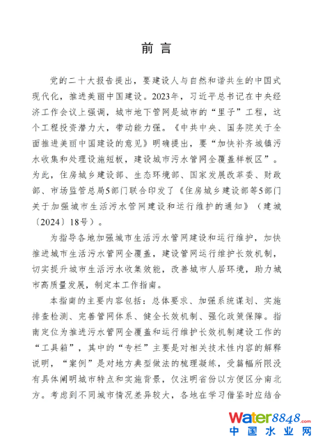 為落實(shí)黨中央、國務(wù)院有關(guān)工作部署,加快推進(jìn)城市生活污水管網(wǎng)全覆蓋,建立健全污水管網(wǎng)建設(shè)運(yùn)維長效機(jī)制,切實(shí)提升城市生活污水收集效能,我們組織編制了《推進(jìn)城市生活污水管網(wǎng)全覆蓋及廠網(wǎng)一體長效機(jī)制建設(shè)工作指南(第一版)》,現(xiàn)印發(fā)給你們,請(qǐng)結(jié)合實(shí)際參照?qǐng)?zhí)行。