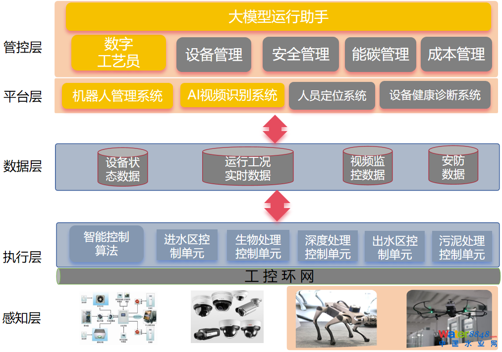以全地下形式的泰和污水處理廠為試點(diǎn)單位,運(yùn)用大數(shù)據(jù)、BIM、人工智能等新興信息技術(shù),打造一座“感知智能化、運(yùn)維信息化、設(shè)施數(shù)字化、管理精細(xì)化”的智慧污水處理廠。智慧污水處理廠工藝調(diào)控、設(shè)備管理和安全管理等主要生產(chǎn)管理工作均依托相應(yīng)的應(yīng)用系統(tǒng)展開(kāi),現(xiàn)場(chǎng)操作依靠控制邏輯完善的閉環(huán)工控系統(tǒng)替代人工操作,現(xiàn)場(chǎng)感知體系由傳統(tǒng)的儀表和各類(lèi)新型機(jī)器人組成。