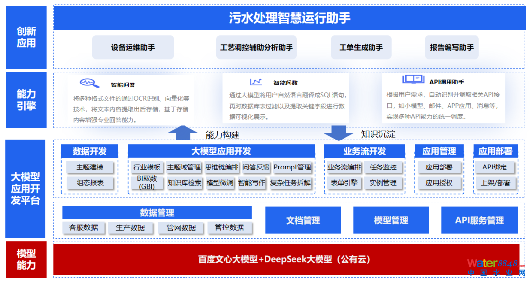 基于通用大模型的智慧運(yùn)行助手。采用通用大模型(LLM模型)建立智慧運(yùn)行助手,形成一個(gè)虛擬的“全能型”污水處理技術(shù)人員,可為工藝人員提供工藝調(diào)控優(yōu)化建議,為設(shè)備管理人員和安全管理人員提供精準(zhǔn)的專(zhuān)業(yè)知識(shí)。