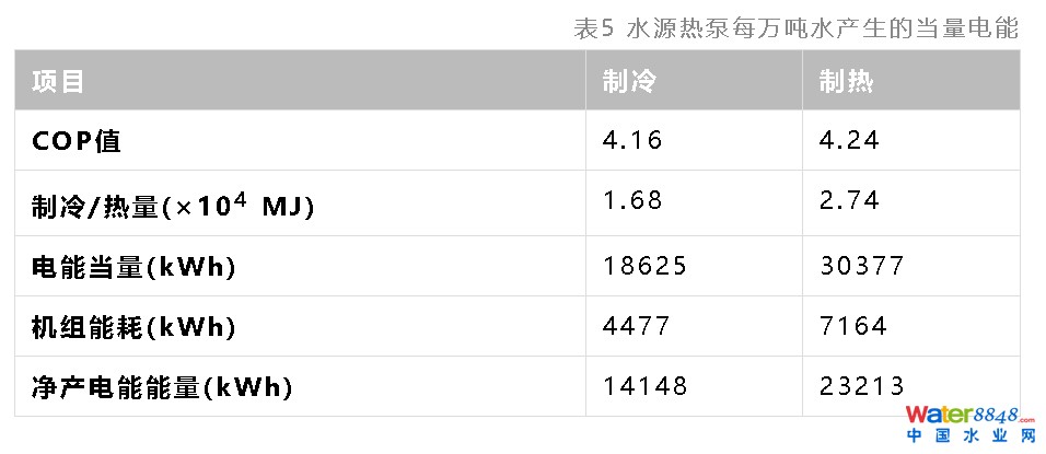 通過(guò)計(jì)算可知(表5),水源熱泵系統(tǒng)每利用1萬(wàn)噸二級(jí)出水的制冷量和制熱量分別為1.68×105 MJ和2.74 MJ,考慮水源熱泵機(jī)組自身能耗(通過(guò)COP定義得出),則二級(jí)出水在夏季和冬季凈產(chǎn)能當(dāng)量分別為14148 kWh/萬(wàn)m3和23213 kWh/萬(wàn)m3。由此可知,污水中的熱能是污水廠最大的能量“家底”。據(jù)此匡算,案例污水廠每天僅利用8萬(wàn)噸二級(jí)出水(即13.3%的出水量)作為污水源熱泵的冷、熱源,就可滿足污水廠運(yùn)行能耗的51%(制冷)和83.6%(制熱)。加上上述提及的污泥厭氧消化和太陽(yáng)能回收,案例污水廠已可實(shí)現(xiàn)“能量平衡”。