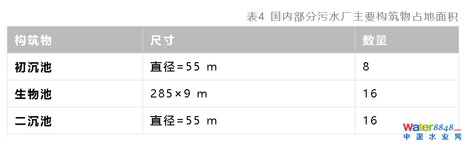 按照E20-327型光伏板性能、案例污水廠所在地的光照條件,單塊光伏板每天產(chǎn)生的能量約為1.09 kWh(單板占地面積為4.65 m2)。如果在案例污水廠主要構(gòu)筑物平面(表4)上安裝E20-327型光伏板,可計(jì)算得其可回收的太陽(yáng)能總量為82725 MJ/d,僅僅能滿足案例污水廠運(yùn)行能耗的10.4%,即通過(guò)光伏發(fā)電可獲取的能量顯得有些“微不足道”!