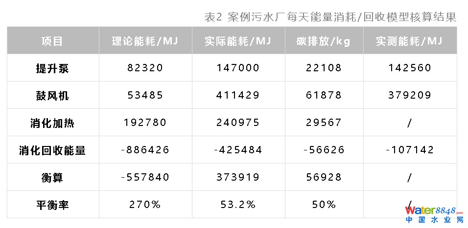 從最終的能量匡算結(jié)果來(lái)看,此案例污水廠從剩余污泥回收的能量可以提供能耗總量的53.2%,也就是說(shuō)案例污水廠如果僅僅依賴污水中的有機(jī)物通過(guò)厭氧消化回收能量,距“能量平衡”目標(biāo)尚且有一半的差距。