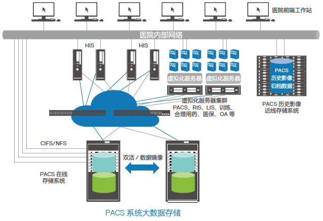 高速調(diào)用影像:采用 SAN+NAS 存儲(chǔ)作為核心存儲(chǔ),存儲(chǔ) PACS 系統(tǒng)數(shù)據(jù)庫(kù)和在線的 PACS影像文件,提供高速的數(shù)據(jù)訪問能力;